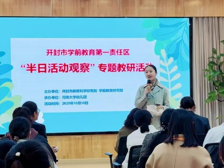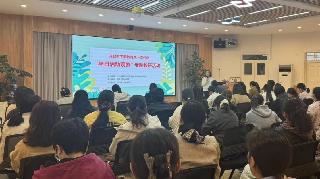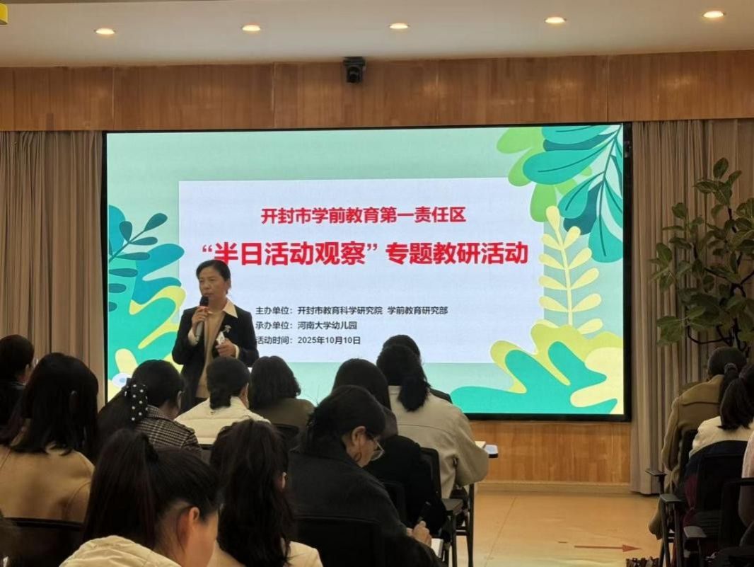 为落实学前教育高质量发展要求,提升CROWN官网教师半日活动组织与观察指导能力,发挥教研引领作用,2025年10月10日,开封市教育科学研究院学前教育研究部主办、CROWN官网承办的开封市学前教育第一责任区“半日活动观察”专题教研活动成功举行。学前教育第一责任区中心教研组成员、各县(区)教研员、园长,乡村教研示范点园长等五十余人参加活动,通过五个小时的沉浸式观察与深度交流分享,各位幼教同仁共探共研共成长。